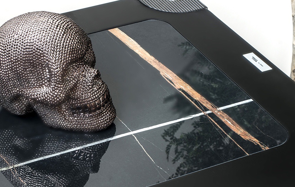 Black Marquinia: A HDF polc mély fekete színe, a fényes karbon sarok felfüggesztés és a márvány elegáns sötétsége nagyon elegáns kombinációja.