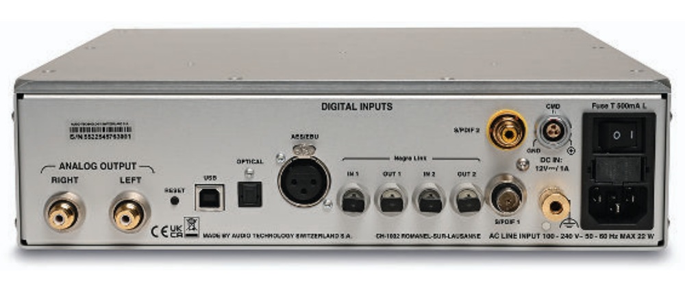 A hátlapon minden fontos csatlakozás típust megtalál. Az USB bemenethez számítógépet, vagy digitális futóművet, a koaxiális és optikai bemeneteihez pedig hagyományos forrásokat csatlakoztathat. Az AES/EBU szimmetrikus digitális SPDIF bemenet pedig High-End futómű jelét tudja fogadni.