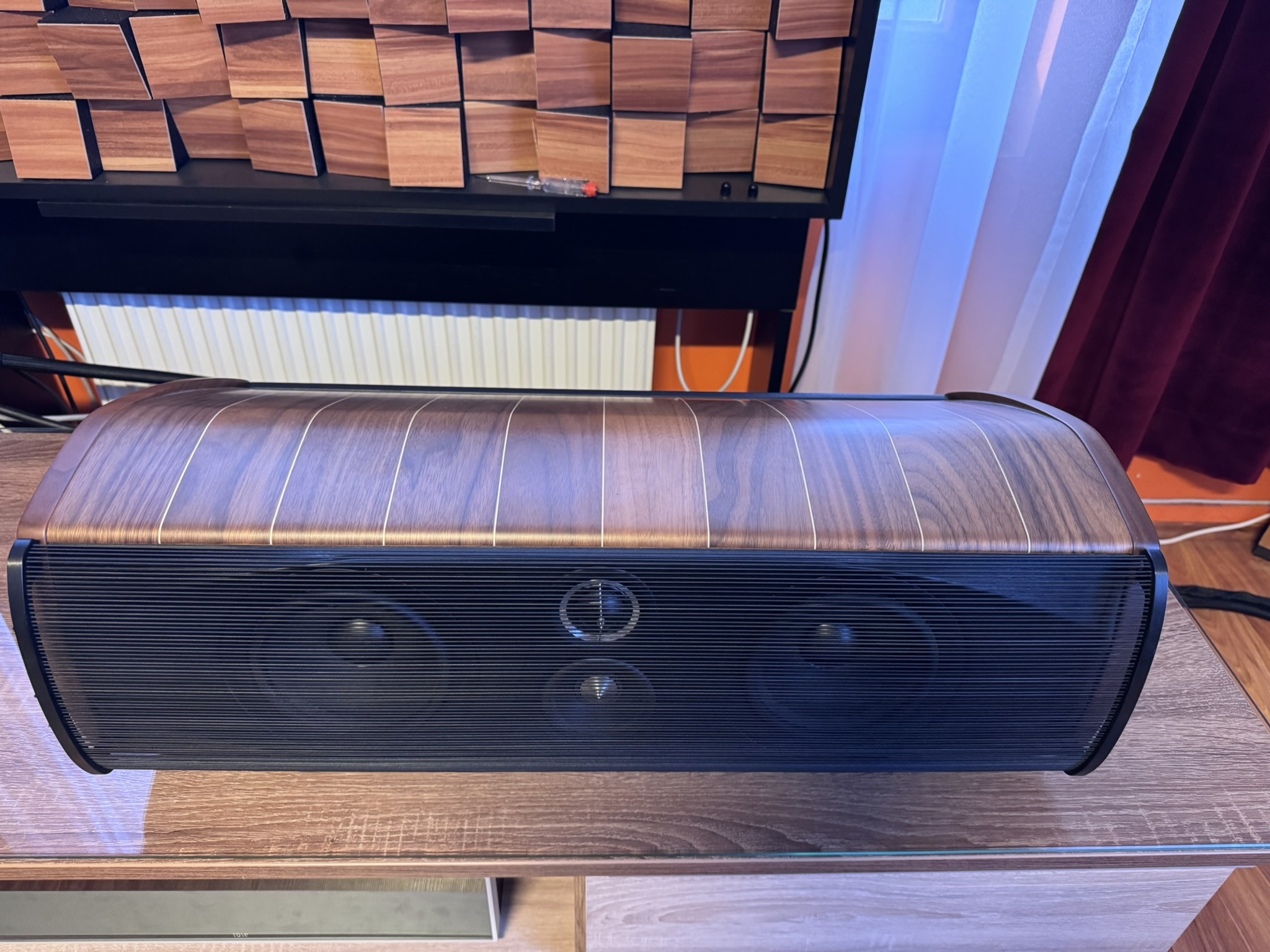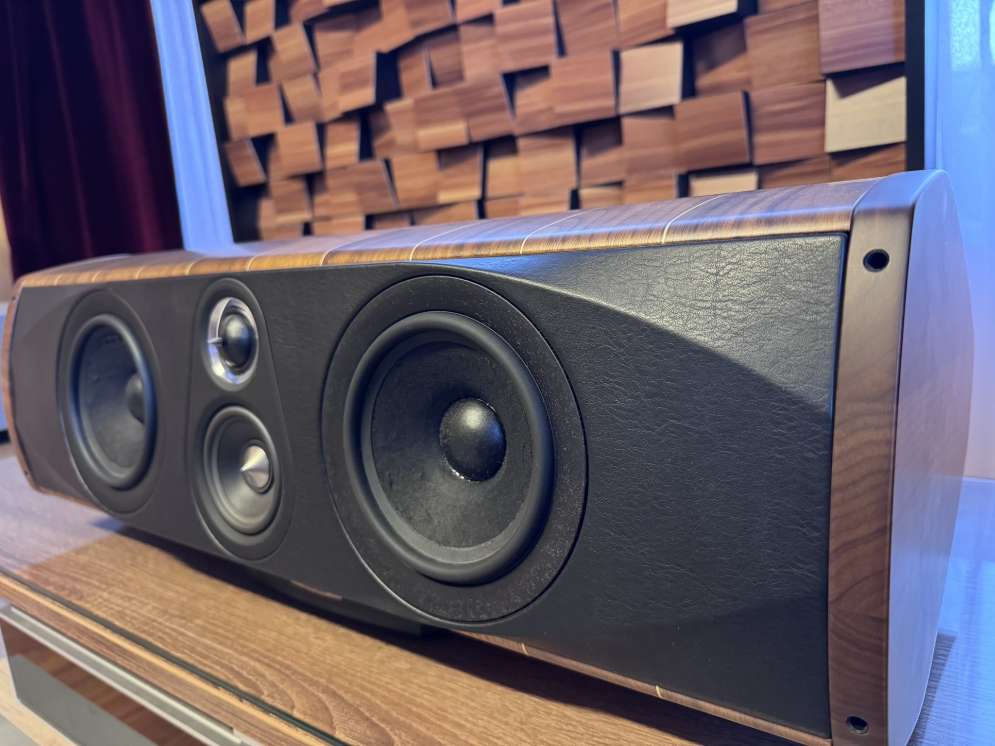 Enhanced “Lyre” shape design, progressive thickness triple curvature cabinet walls damped spread resonance spectrum system. Solid wengé vertical clamps.